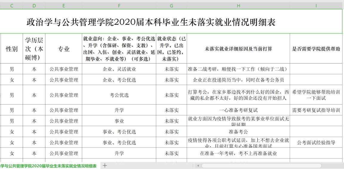 深入调查,建立一类一策指导台账。积极引导每一位本科毕业生认认清当前就业形势、转变求职方式、积极主动地应对在新冠肺炎疫情影响下的求职工作。安排班委详细了解每一位未落实就业的毕业生情况,深入调查学生未就业的原因、当前的就业意向以及需要学院提供的帮助。按“一类一策”建立学生就业工作台账,为就业困难的同学提供针对性的服务和帮助。