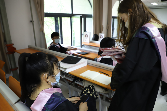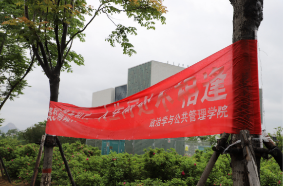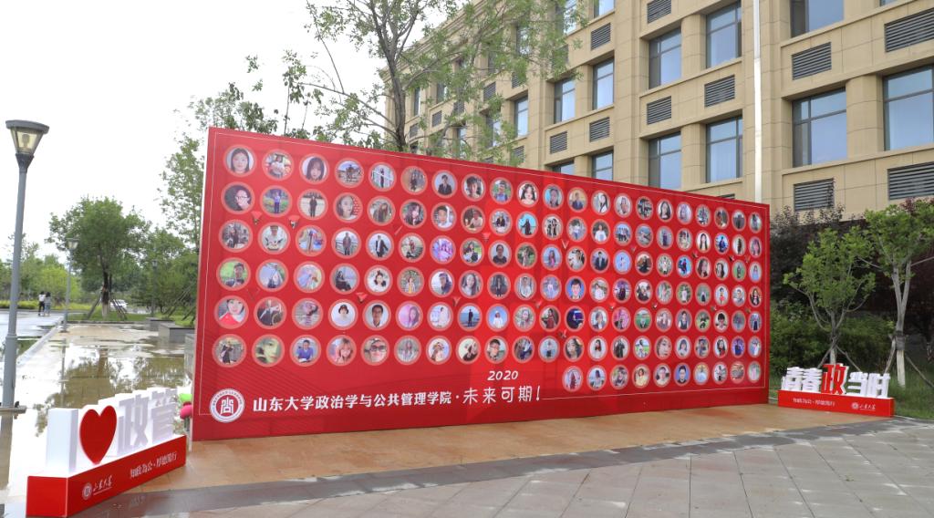 “我与政管”留影活动。学院制作了包括全体毕业生照片的创意背景板,并在院楼门厅摆放“I LOVE 政管”“青春政当时”等创意模型及其他创意板,以供毕业生进行合影留念。