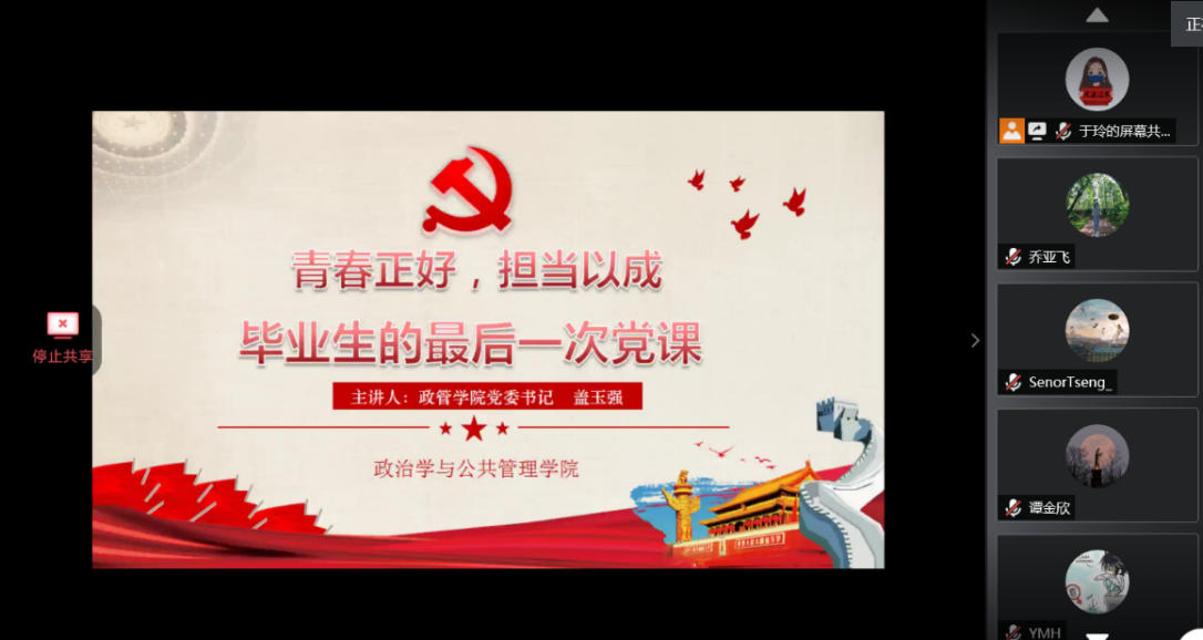 “青春‘政’好,担当以行”毕业生主题教育系列活动。学院组织开展党委书记讲党课、院长讲最后一课等主题教育系列活动,鼓励学生在毕业走向社会之时,继续发扬“知政为公,厚德笃行”的院训,增强家国情怀,社会担当和感恩意识,在国家和社会的发展中实现自己的人生价值。
