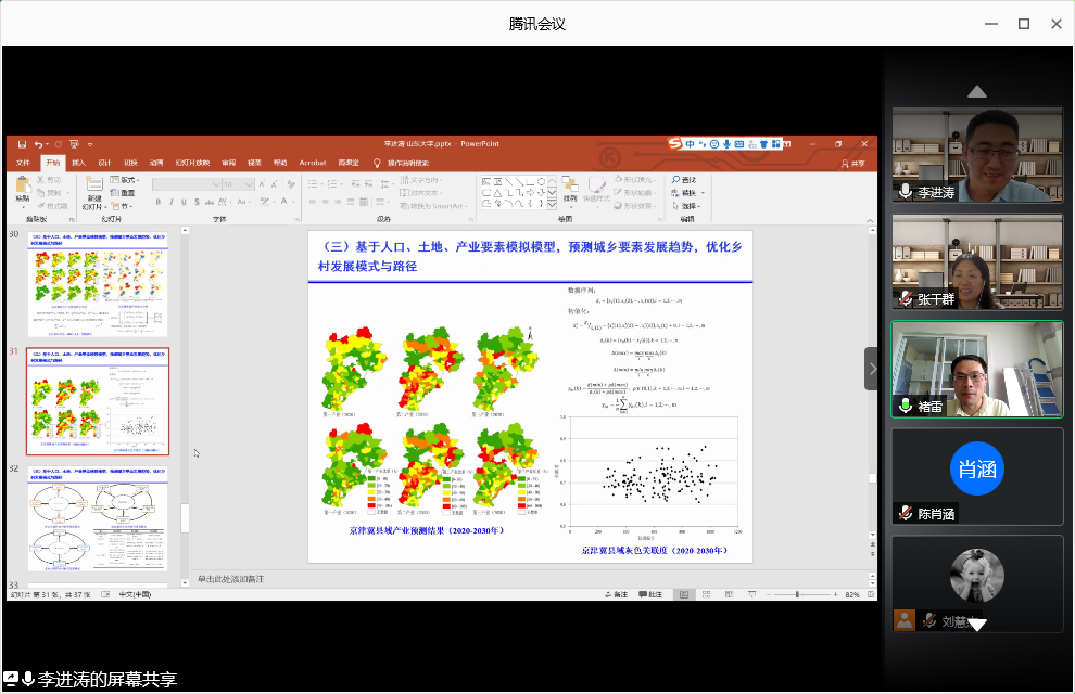 专题讲座部分,李进涛老师结合自身研究成果,从时空格局、驱动机制、模拟优化三个方面讲解了城乡发展转型与土地利用中空间分析方法的运用。在时空格局上,可基于社会经济数据,分析典型地区乡村转型发展空间分布格局,探索案例县域网格化乡村发展规律;基于土地利用栅格数据,分析典型地区城市建设用地发展空间格局,揭示城市的扩张规律;基于高分遥感影像解译数据,分析土地利用时空变化特征,揭示土地利用转型规律。在驱动机制上,可利用面板回归数据获取驱动因素弹性系数,建立系统-子系统-要素多维驱动要素测度体系,探析要素与系统驱动机制;创新“时-空”要素同时驱动城乡发展规模与方向的作用机制,基于“人-地-业”视角构建“推-拉”驱动作用的城乡转型发展路径测度模型。在模拟优化上,可利用协同效应模型,基于“社会-经济”与“生态-环境”评估不同情境下土地利用变化效应;利用空间集聚作用,科学划分乡村地域类型;基于城乡发展规律与驱动机制,优化定位城乡发展功能区。