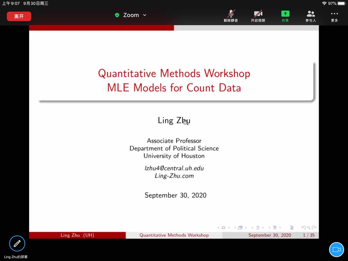 9月16日起,休斯顿大学政治科学系的朱凌副教授应邀为我院师生开设“望远学术沙龙之高级量化研究方法工作坊”系列学术讲座,该讲座共开设三场,采用线上方式进行,吸引校内外师生百余人次参加。在三场系列讲座中,朱凌老师先后介绍了多层数据分析模型、潜变量测量模型以及count data和极大似然估计统计模型,并使用R语言编程为同学们演示了各类模型的具体实现过程。该讲座由av视频
