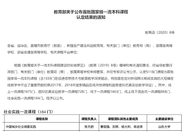 张天舒老师领衔的《中国城乡社会调查实践》喜获认定,获批社会实践类国家级一流本科课程。