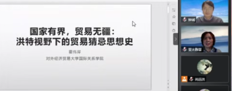 亚太研究所联合主办、亚太所社会与文化研究中心承办的“社会与人文”系列讲座第四讲“国家有界,贸易无疆——洪特视野下的贸易猜忌思想史”在线上成功举办。本次讲座邀请对外经济贸易大学国际关系学院副院长霍伟岸副教授担任主讲人。亚太研究所所长杨鲁慧教授致辞介绍了亚太所的基本情况并对参与讲座的老师和同学表示热烈欢迎,亚太所副所长赵玙佳、东北大学文法学院副教授张继亮作为评议人也参加了此次讲座。讲座由亚太研究所副所长钟诚主持。