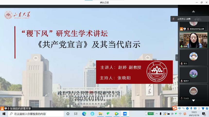 副教授赵婷老师作了题为“《共产党宣言》及其当代启示”的线上主题报告,吸引了超过200名研究生同学的积极参与。