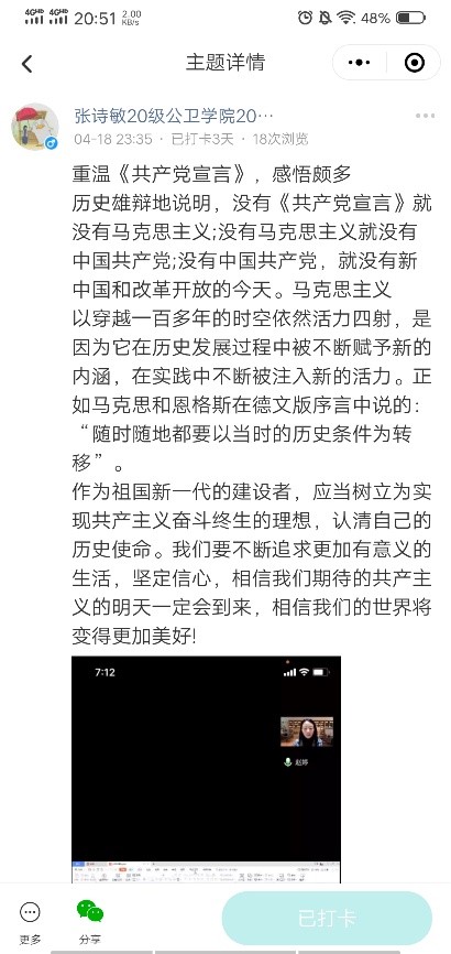 讲座结束后,各校区参会研究生在打卡小程序上打卡并分享了自己的感悟。本次讲座的开展,让同学们重温了《共产党宣言》,助推大家深刻感悟和把握马克思主义真理的力量并坚定马克思主义信仰,提升了同学们将《共产党宣言》的科学原理和科学精神运用到社会实践中的能力,真正做到学党史、悟思想、办实事、开新局。