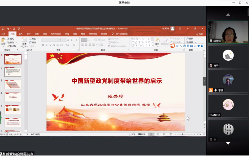 教授臧秀玲作了题为“中国新型政党制度的特色优势与世界意义”的线上主题报告,吸引了80余名研究生同学的积极参与。