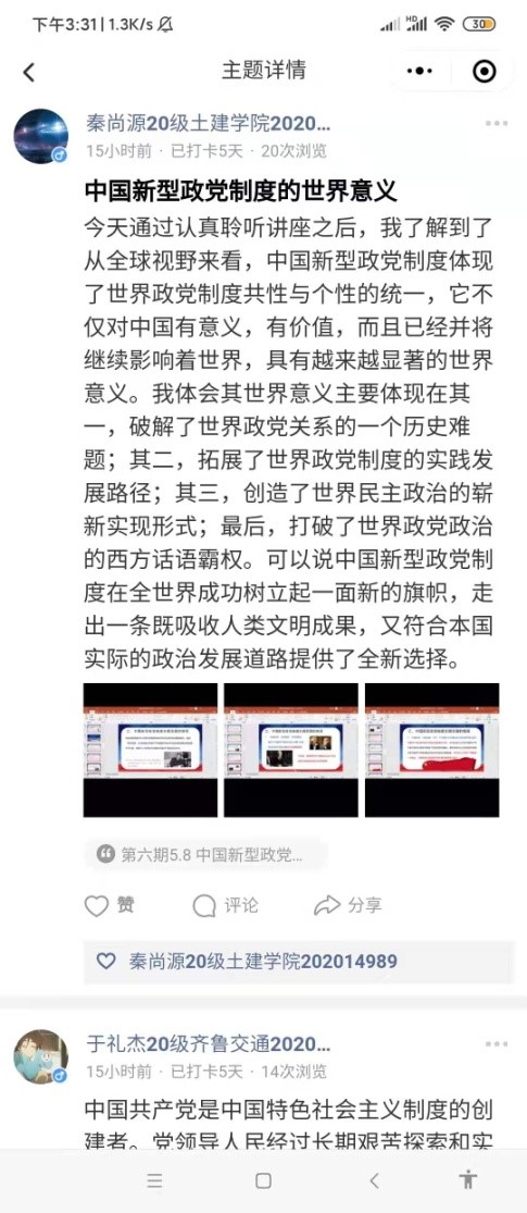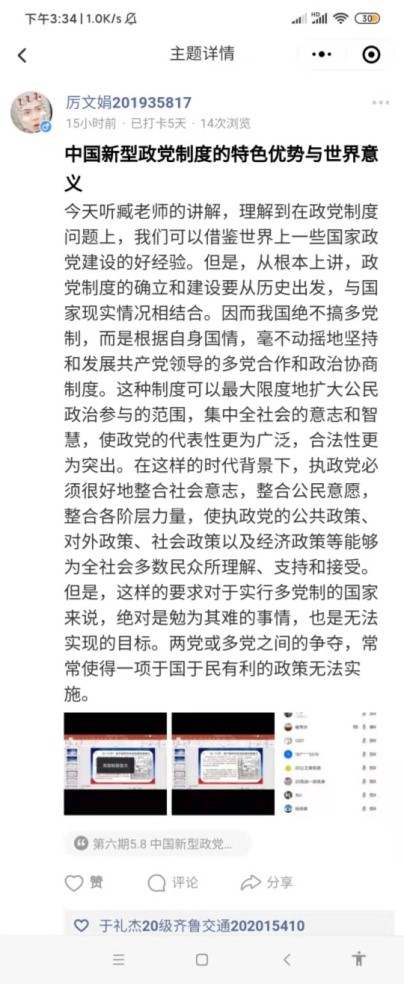 讲座结束后,各校区参会研究生在打卡小程序上打卡并分享了自己的感悟。本次讲座的开展,促使同学们理解并掌握了我国新型政党制度的内涵及时代特征,更加深刻体会到我国政党制度独特的优越性,同时也推动同学们进一步认识和理解党史、国际形势与世界文化,从党的宝贵发展历程中汲取前进力量与智慧。
