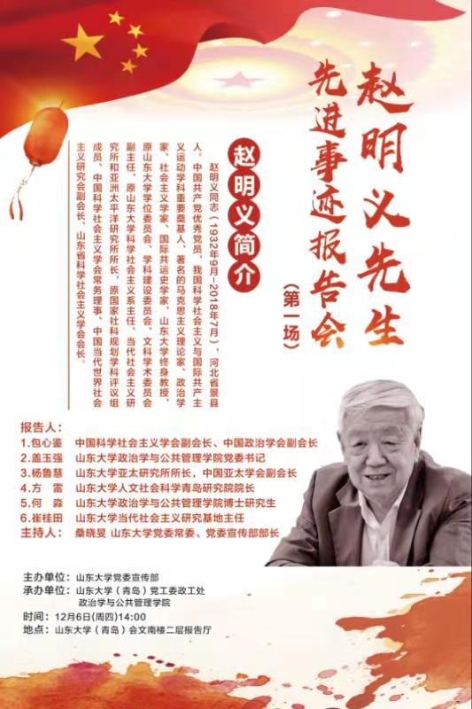 为深切缅怀赵明义先生,全面加强师德师风建设,以立德树人榜样力量激发全院师生追求卓越、只争朝夕的进取精神,经研究,决定举行赵明义先生先进事迹报告会。现将有关事宜通知如下: 会议时间:2018年12月6日(周四)下午13:45就坐完毕 会议地点:青岛校区会文南楼二层报告厅 与会人员:校区和学院领导、事迹报告团成员、学院党委委员、学院各党支部书记、学院学生代表、校区其他学院师生代表等。 请参会人员提前做好工作安排,按时参会。