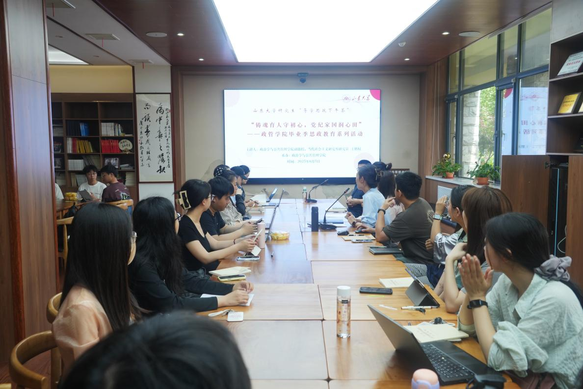 举办“铸魂育人守初心,党纪家国润心田”——导学思政下午茶毕业季思政教育系列活动。政管学院副教授、当代社会主义研究所副研究员王鹏权担任主讲人,为毕业生和学生党员带来了一场具有深刻内涵的思政教育专题讲座。活动由学院2021级博士毕业生辅导员赵玉洁主持,学院30余名师生参与此次活动。