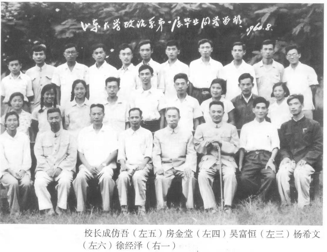 1960年3月6日,政治系举行开学典礼,成仿吾校长在会上作《做无产阶级理论战士》的报告。首批学生80人,从历史、中文、外文三系四个年级中,挑选出一定数量的好学生,相应地构成政治系的年级序列。其中四年级12名,三年级13名,二年级26名,一年级29名。1960年8月,首届学生毕业,杨尊明便是其中之一,毕业后,他留校任教,并于1961年正式调入政治系,从此开启了他长达三十余年的社会主义理论教学与研究生涯。可以说,杨尊明既是政治系创建初期的亲历者,也是见证并推动其发展变迁的重要参与者。